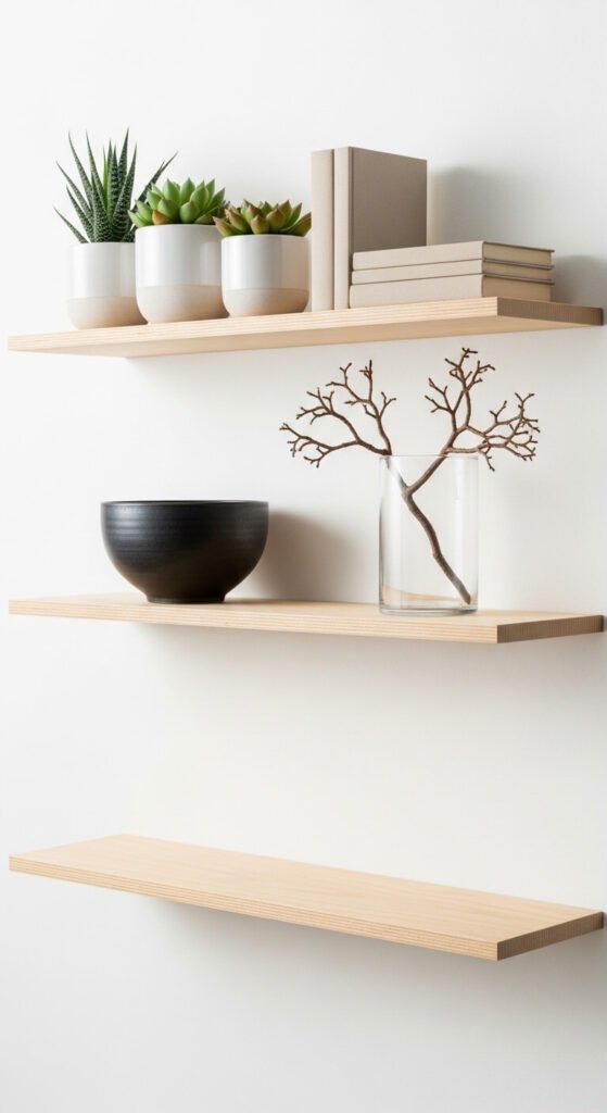 Build simple shelves from pine boards and brackets for under $25. Paint them matte white or leave natural. Display only what you love—a plant, a handmade bowl, a favorite book.