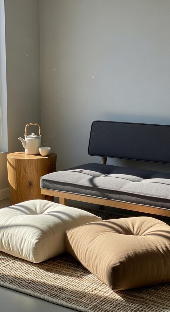 Choose seating that sits close to the ground. Low sofas, poufs, and floor cushions create a relaxed, grounded atmosphere.