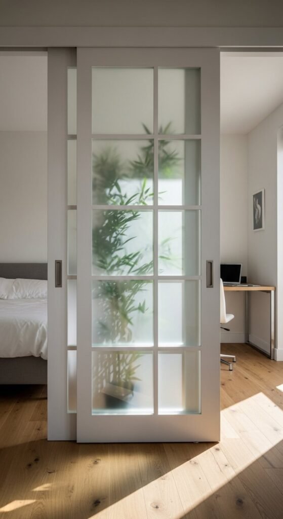 Build simple frames from pine and stretch white fabric or frosted contact paper for under $50. Install sliding barn door hardware from a hardware store. Keep panels light-colored to maintain brightness.