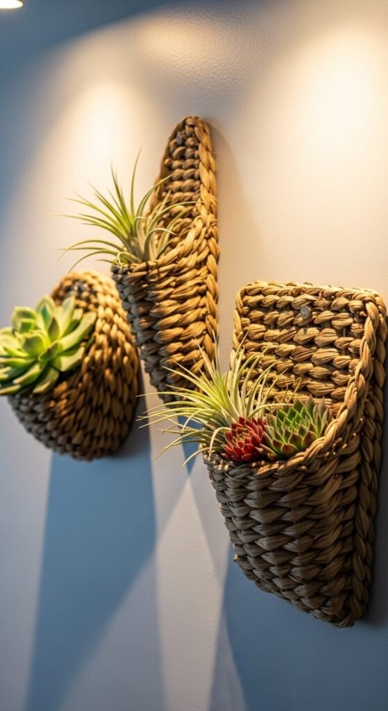 Wall pockets merge storage and art. These woven holders display small plants while saving surface space.