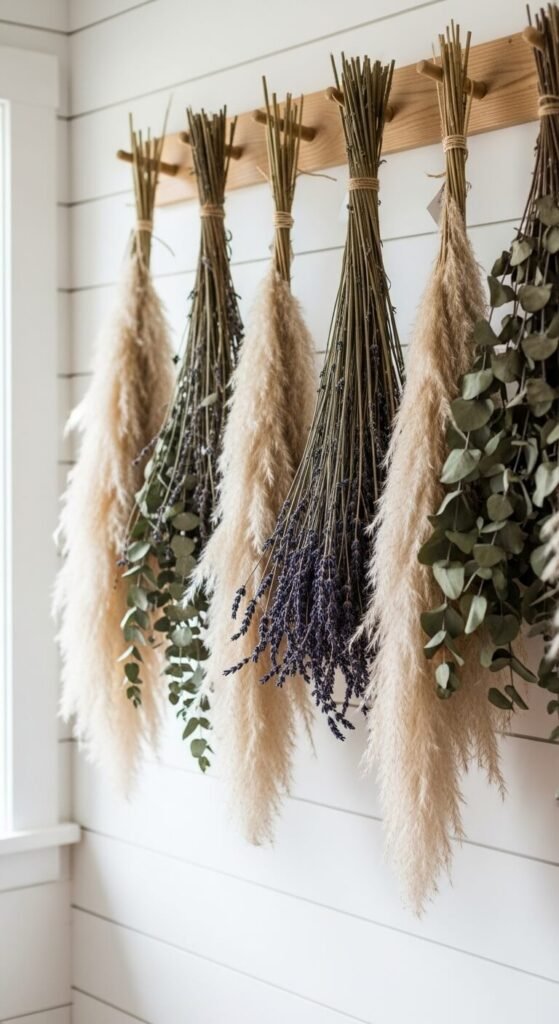 Gather pampas grass, baby’s breath, and eucalyptus. Tie bundles with twine and hang from hooks or a wooden dowel. Each bundle costs $8-12 at craft stores.