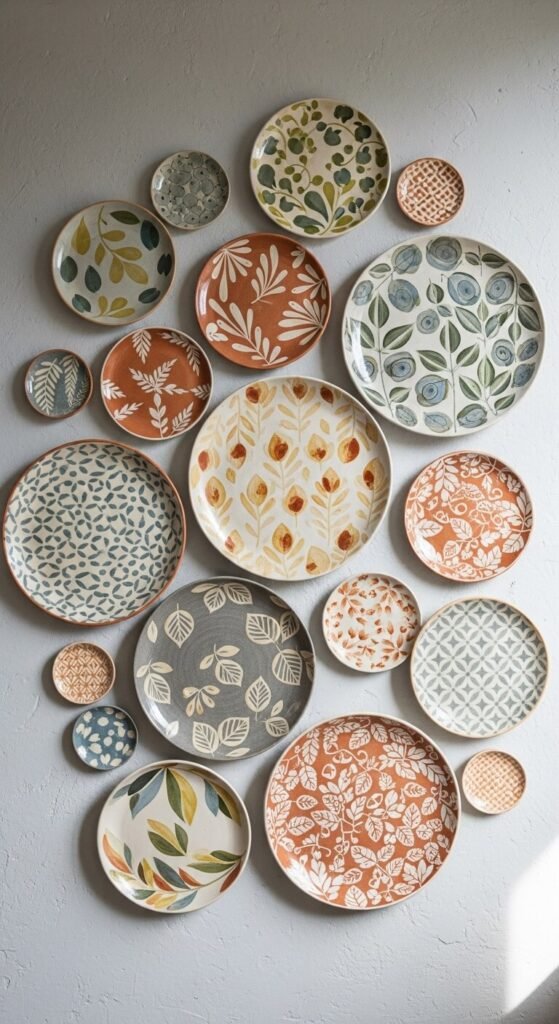 Decorative plates create dimensional art. Layer them for depth and cultural character.