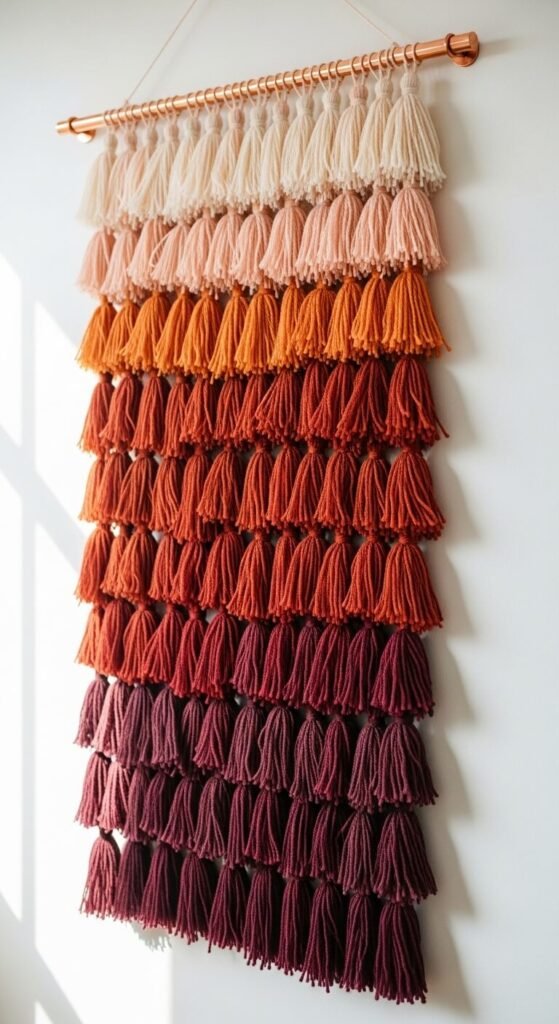 Attach tassels to a base fabric or directly to a dowel. Arrange colors from light to dark for the gradient effect. Total cost runs $15-25.