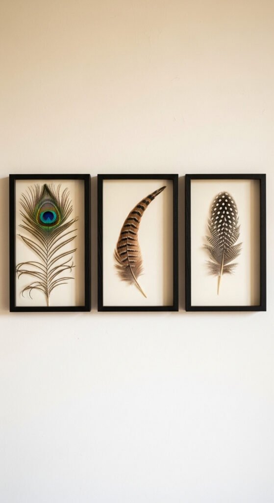 Display 3-5 feathers in a row or grid pattern. Choose similar frame styles for cohesion. The natural browns, grays, and occasional color pops work universally.