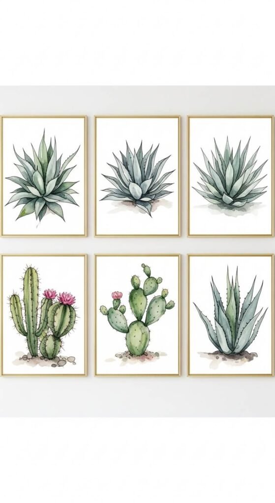 Download free printables or commission affordable prints on Etsy for $15-25 each. Frame in matching slim frames for a gallery feel.