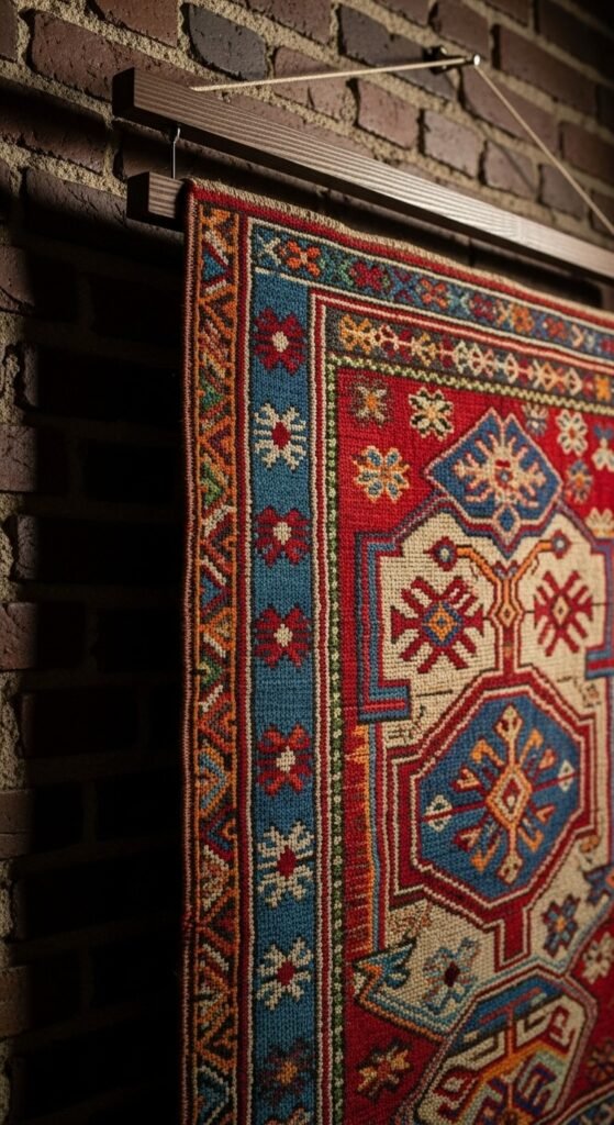 Old textiles gain new life as wall art. Kilim rugs, embroidered fabrics, and vintage quilts all work.