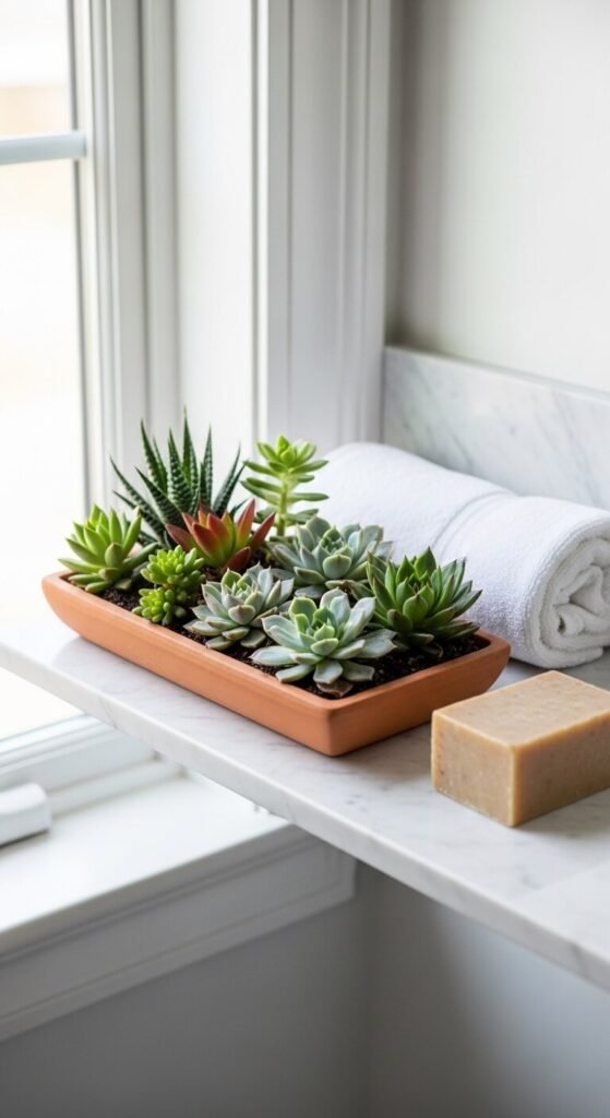 Use a flat terracotta tray or saucer as a bathroom shelf display. It holds small plants, soaps, or folded hand towels beautifully. Large clay saucers cost just $3–$8 at garden centers. Sand the edges slightly for a smoother finish. Group a few small succulents, a candle, and a stone or soap dish on top. It turns a boring bathroom shelf into something that looks like a boutique spa. Works in any bathroom, small or large. The contrast of the warm terracotta against white bathroom tiles is striking.