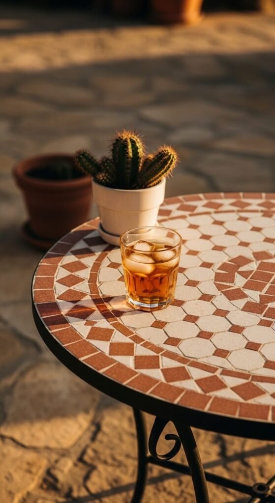 A mosaic side table with terracotta tones is a conversation starter in any room. Look for these at flea markets, import stores, or Moroccan-style home shops. Prices vary wildly — you can find them for $30 second-hand or pay $150 new. DIY version: buy a cheap round side table and use terracotta mosaic tile stickers on the top surface. Grout sealer keeps them in place. Use it as a plant stand, a coffee table companion, or an outdoor accent. It brings color, pattern, and warmth together in one compact piece.