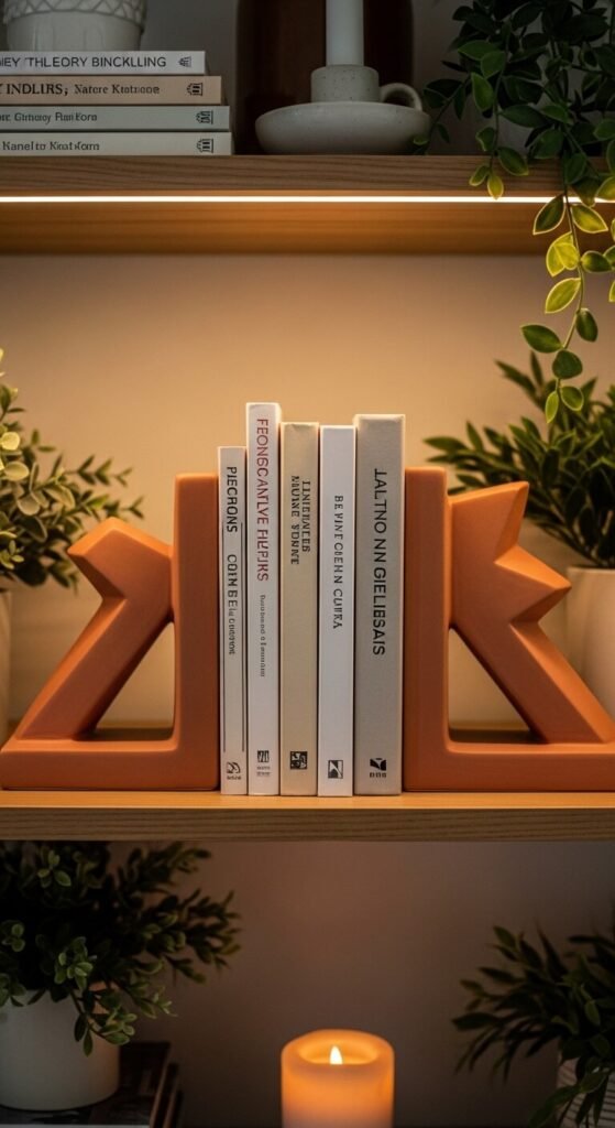 Terracotta bookends are a small detail that adds up quickly. They anchor your books while adding earthy color to any shelf. Look for geometric or organic shapes — arched, pyramid, or hand-formed styles work beautifully. You can find these on Etsy for $20–$40. DIY version: take plain wooden bookends and paint them with clay-based or terracotta-toned chalk paint. It dries matte and looks like the real thing. Use them in your living room, home office, or bedroom shelf. Small details like these show a level of intentionality that pulls the whole room together.