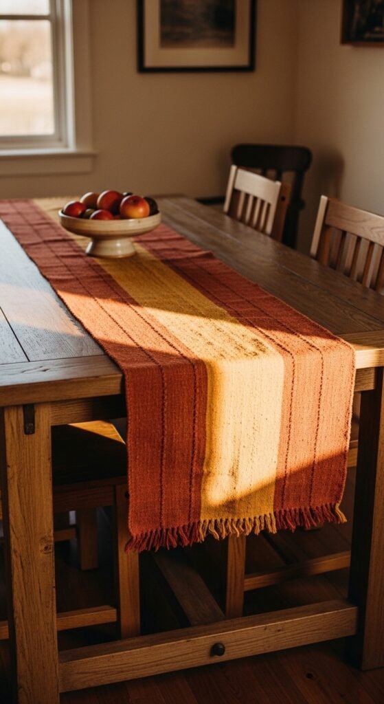 A table runner in terracotta, rust, or burnt sienna instantly sets the tone for your dining room without requiring any furniture changes. Look for woven cotton, linen, or kilim-style runners. These often run $15–$35 online. Layer it over a plain tablecloth or directly on the wood. Pair it with mismatched clay pots as candle holders down the center. The whole look takes five minutes to put together and photographs beautifully. Swap it out seasonally — autumn and winter are perfect for terracotta tones.