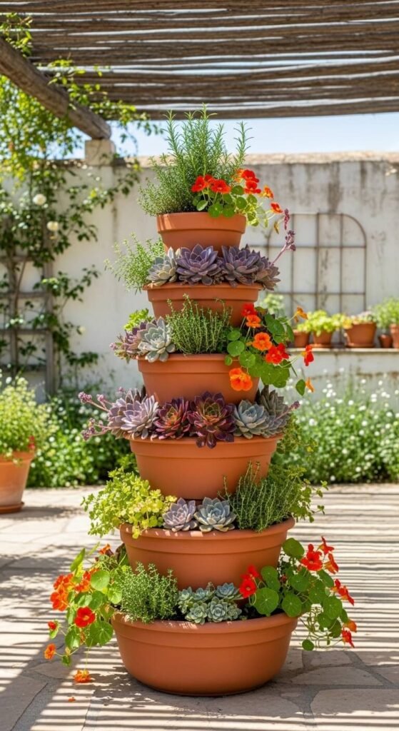17. Terracotta Planters Stacked as a Tiered Garden Display