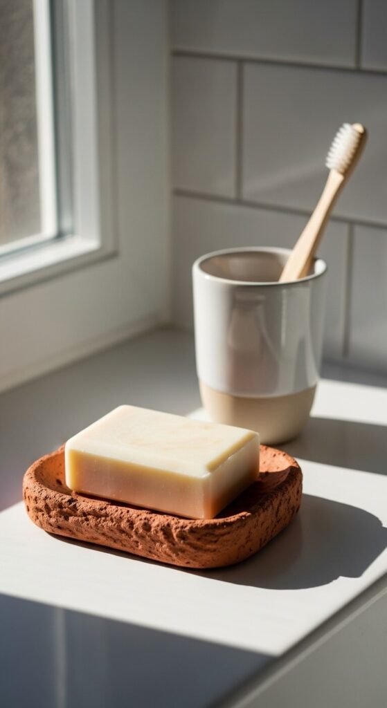 Swap your plastic soap dish for a handmade terracotta one. It’s a $5–$12 change that looks luxurious on any bathroom counter. The clay is naturally porous, which actually helps bars of soap dry faster and last longer — bonus. Look for flat, slightly raised clay dishes with drainage ridges on the bottom. Many pottery shops and Etsy sellers offer these in bulk or custom-made. Pair with a matching small tray or clay cup for your toothbrush. A tiny upgrade that makes your whole bathroom feel more considered and beautiful.