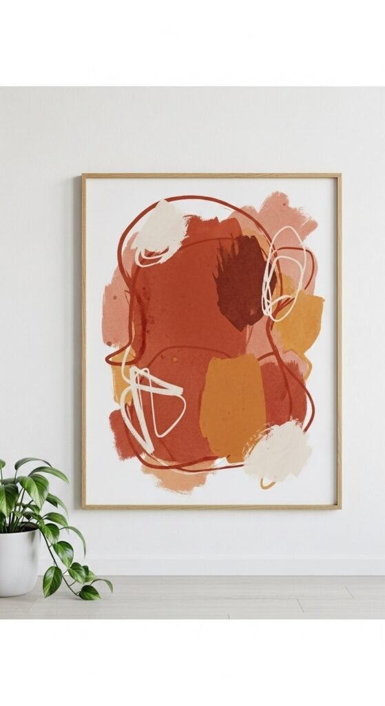 You don’t need to spend thousands on original art. Print a large terracotta abstract from Etsy or Creative Market for $5–$15 and frame it yourself. Look for gestural paintings, geometric prints, or Mediterranean landscape photography in warm clay tones. A large frame from IKEA (the RIBBA range) costs under $20. The combination of a big, warm print and a simple frame reads as intentional, gallery-quality decor. Place it above a console table, sofa, or bed as a focal point. This is one of the most underrated affordable art moves you can make.