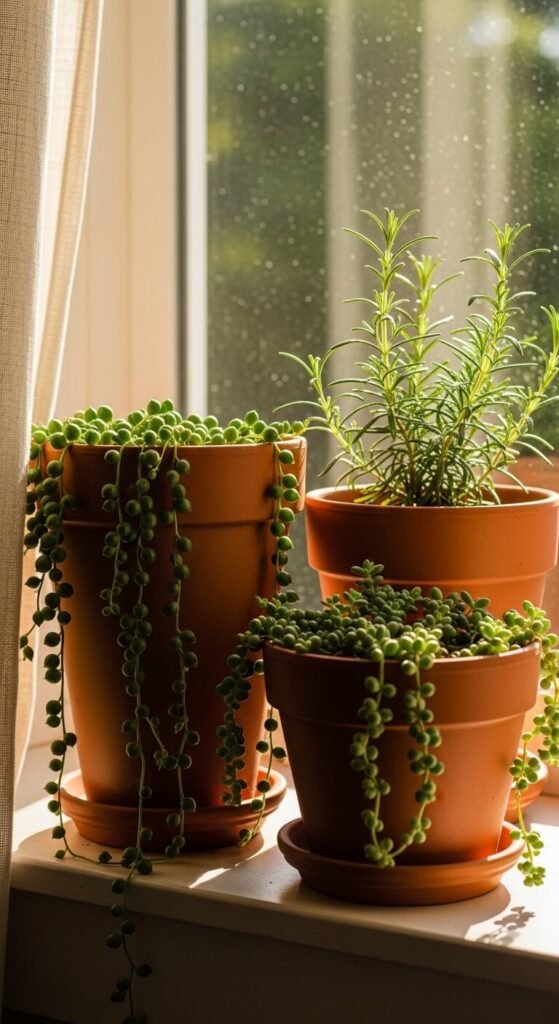 Group three or more unglazed terracotta pots on your windowsill. Vary the heights — use small, medium, and tall. Plant herbs like rosemary, basil, or thyme for a functional Mediterranean touch. The earthy clay against green leaves is a simple, classic pairing. You can find basic clay pots at any garden center for $2–$5 each. Don’t overthink it. Stack a book or small brick under one pot to create a height difference. It looks curated without any real effort.