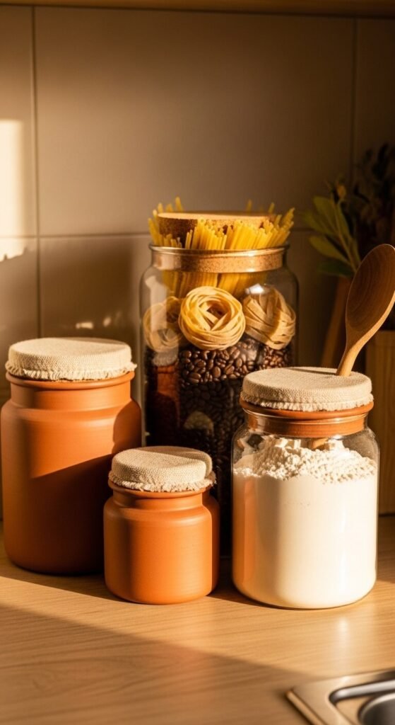 Replace plastic kitchen canisters with terracotta ceramic ones. They hold coffee, flour, sugar, dried pasta, or rice. They keep contents cool and the material breathes naturally. Look for sets with cork or linen lids for extra texture. Sets of three can be found for $25–$45 online or at home goods stores. Even one standalone terracotta jar on your counter adds color and warmth. It makes everyday kitchen items feel deliberate and beautiful rather than utilitarian. A kitchen that looks this good is a kitchen you actually want to cook in.
