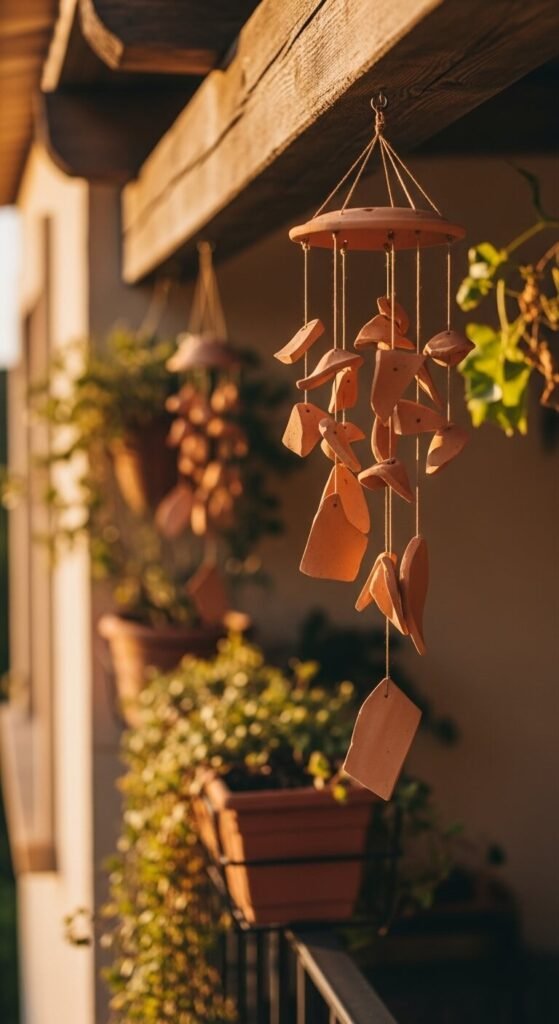 Terracotta wind chimes add sound, movement, and visual texture to any outdoor space. The soft clinking of clay pieces is gentler and more earthy than metal chimes. You can buy handmade ones from craft fairs or Etsy for $15–$30. DIY version: drill holes in terracotta pot bottoms and string them with jute twine at different lengths. Hang a larger pot as the top anchor. Seal with outdoor sealer to protect from rain. Hang near your front door, balcony railing, or porch beam. It’s charming, affordable, and completely unique.