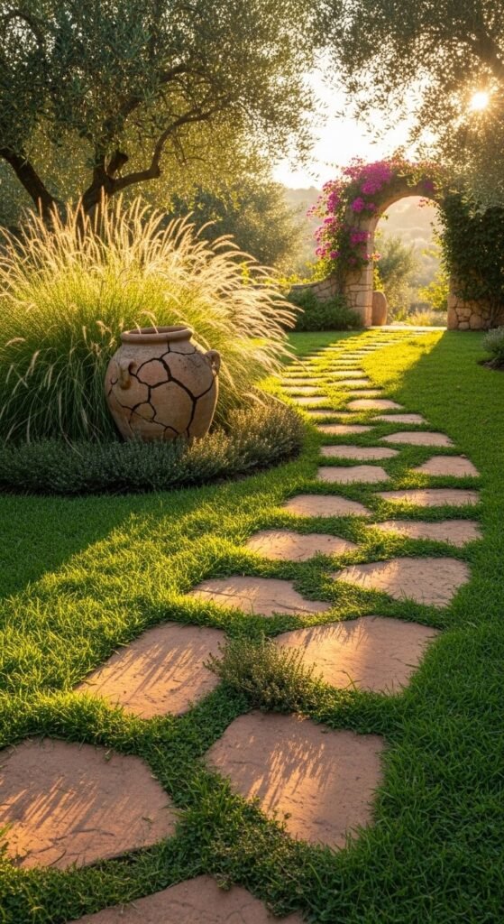 Use terracotta-toned stepping stones to create a warm, Mediterranean-style garden path. You can buy pre-made terracotta or clay-toned concrete pavers for $2–$5 each at garden centers. DIY option: pour concrete into molds and paint with terracotta exterior paint once set. Seal for durability. Place them irregularly — Mediterranean gardens are organic, not perfectly geometric. Fill gaps with creeping thyme, moss, or gravel. Even four to six stones leading to a potted plant area look like a deliberate design choice. It’s a low-cost garden upgrade with serious visual payoff.
