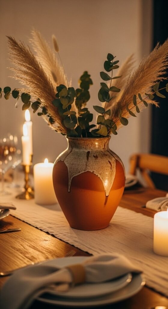 A single terracotta vase on your dining table does more than decorate. It anchors the whole room. Fill it with dried pampas grass, olive branches, or even tall dried wheat stems. These won’t wilt, so no maintenance required. Look for handmade or artisan-style vases at thrift stores or HomeGoods. You don’t need a perfect, symmetrical piece — slightly imperfect ones look more authentic. Set it on a simple linen runner and let it be the star. Minimal effort, maximum warmth.