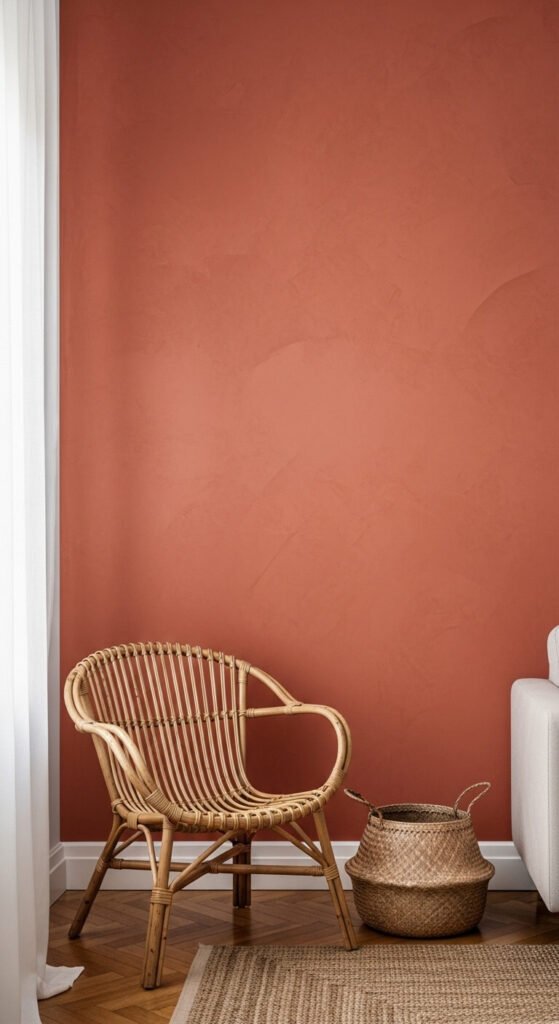 Paint one wall terracotta and watch your entire room transform. One wall is enough. You don’t need to paint the whole room. Choose a matte or flat finish — it mimics the look of natural clay plaster beautifully. Sherwin-Williams “Cavern Clay” and Benjamin Moore “Earthen Jug” are popular picks. A single gallon runs about $40–$60 and covers one wall easily. If you’re renting, use removable peel-and-stick wallpaper in terracotta tones instead. This is the single highest-impact, lowest-cost change you can make.