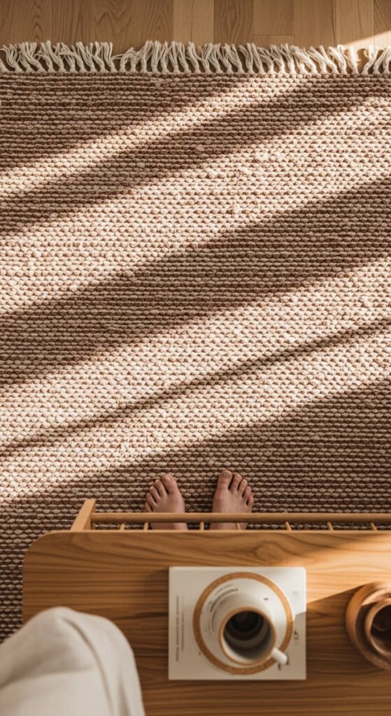 7. Woven Terracotta-Toned Rug Under the Coffee Table