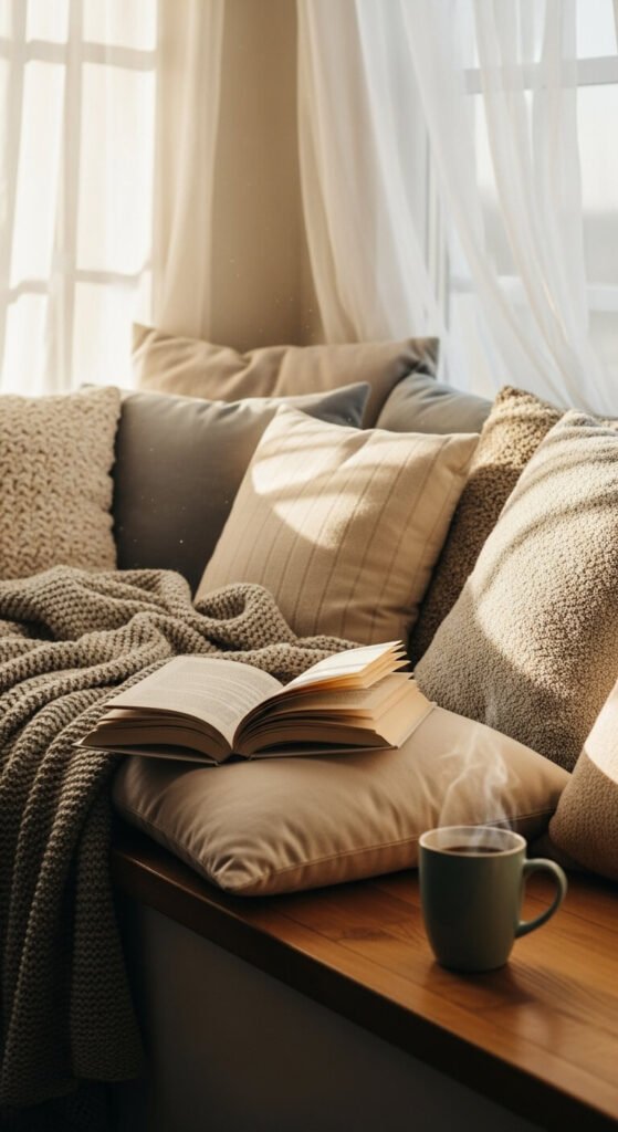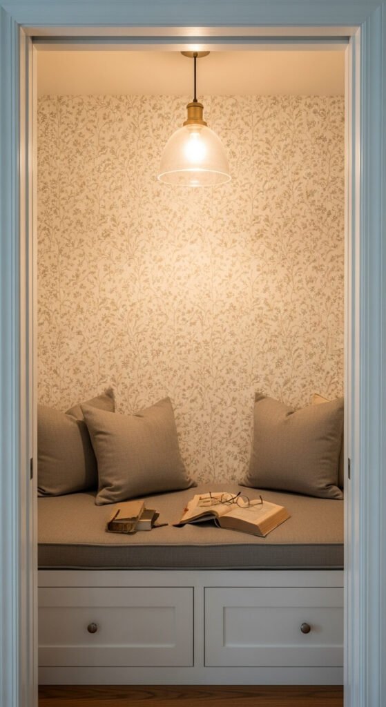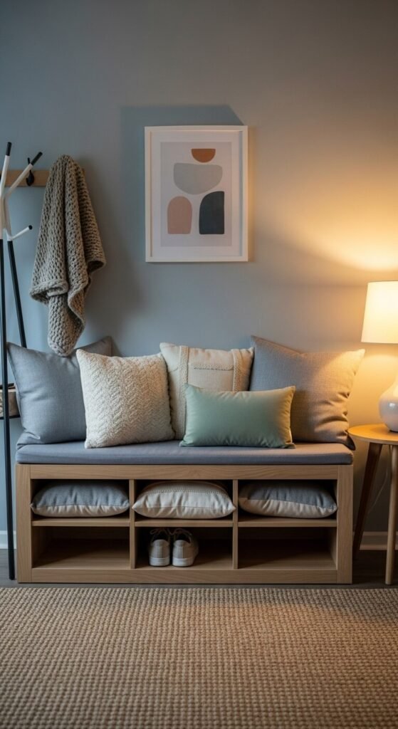 After everyone’s home, the entryway bench becomes reading space. Clear the shoes into nearby storage. Add cushions kept in a basket. The bench sits near the door but away from traffic. A coat rack behind holds your reading throw. The transition zone between outside and inside feels psychologically separate from main living areas. Wall hooks hold a small reading light. Return it to entry function each morning—takes two minutes.