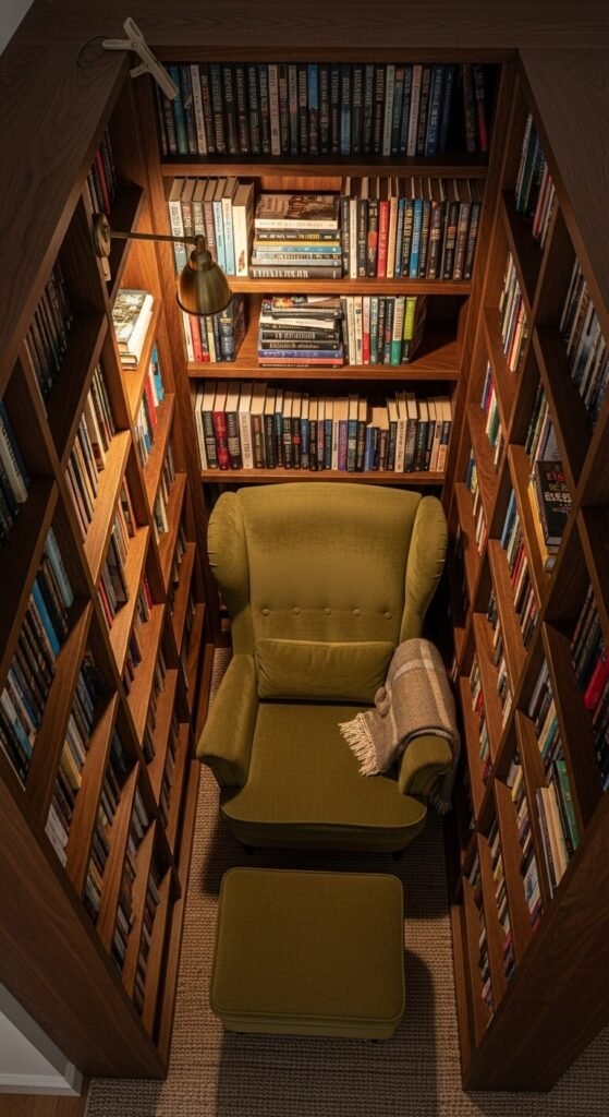 Place two bookshelves perpendicular to a wall, creating three walls. Put your chair in the middle. Books surround you on both sides within arm’s reach. Clip a reading light to a shelf above. The setup blocks visual distractions from the rest of the room. Adjust shelf heights to hold lamps, plants, or tea. This costs almost nothing if you already own the bookcases. Add a small rug to define the space further.