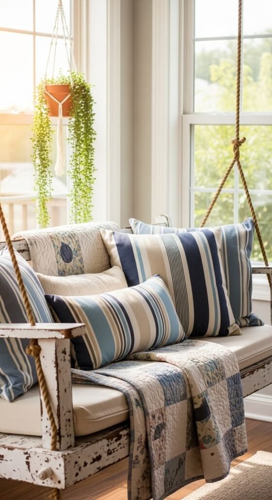 Mount a porch swing from ceiling joists inside your home. Find the joists with a stud finder. Use eye bolts rated for outdoor swings. The gentle motion actually helps some people focus while reading. Place it perpendicular to windows for good light. Waterproof cushions work indoors too and last longer. A small bookcase on wheels slides underneath when not in use. Check weight ratings carefully—most hold 500 pounds safely.