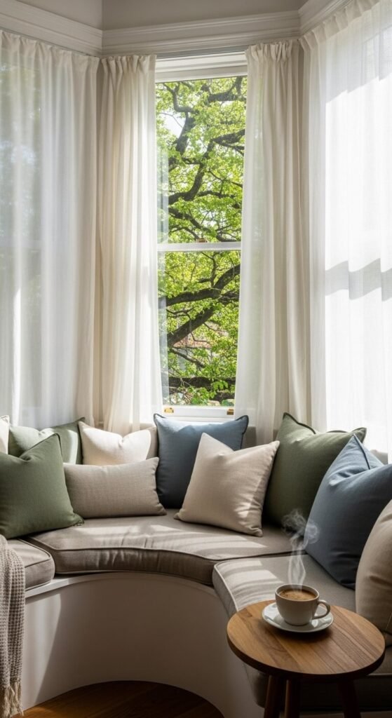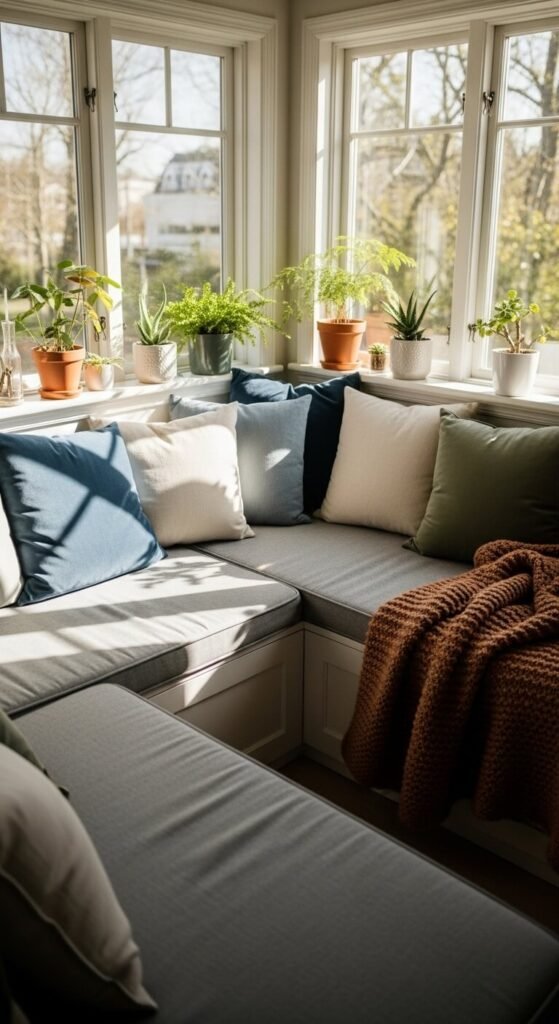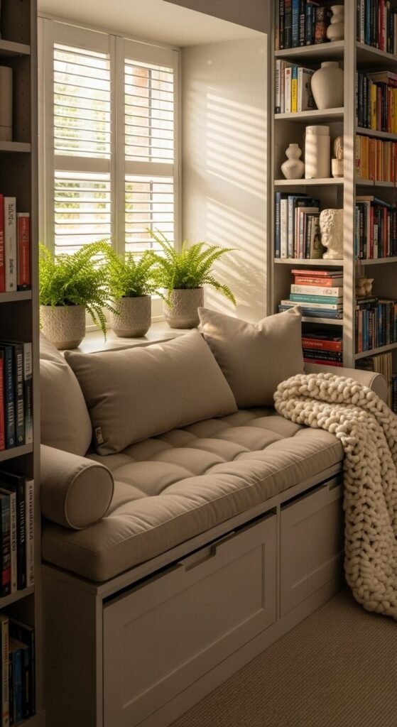 Corner windows offer light from two directions. Build or buy an L-shaped bench to match. Two separate benches pushed together work too. Place pillows in the corner where the sections meet. The double light source means no shadows on your pages. Sheer curtains soften harsh afternoon sun. A small bookshelf fits in the corner behind you. The wrap-around feeling provides surprising privacy even in open-plan spaces.