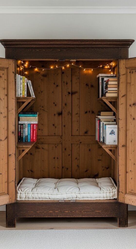 Remove the back panel of an old armoire. Take out the hanging rod. Install a bench seat at the bottom. Add battery-operated lights to the top. The doors close for complete privacy when you want to disappear. Attach small shelves inside the doors using command strips. Paint the interior a different color than the outside. Thrift stores sell old armoires for $50-100. This becomes a literal book box you can hide inside.