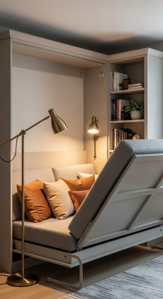 When the Murphy bed folds up, your reading room appears. Mount it against a wall with enough depth behind. The bed conceals everything when guests stay over. Install the seating on a platform that’s the same height as the folded bed. Wall-mounted shelves flank both sides. This solution works brilliantly in studio apartments or converted spaces. The transformation takes seconds. Modern Murphy beds cost $1,500-3,000 installed.