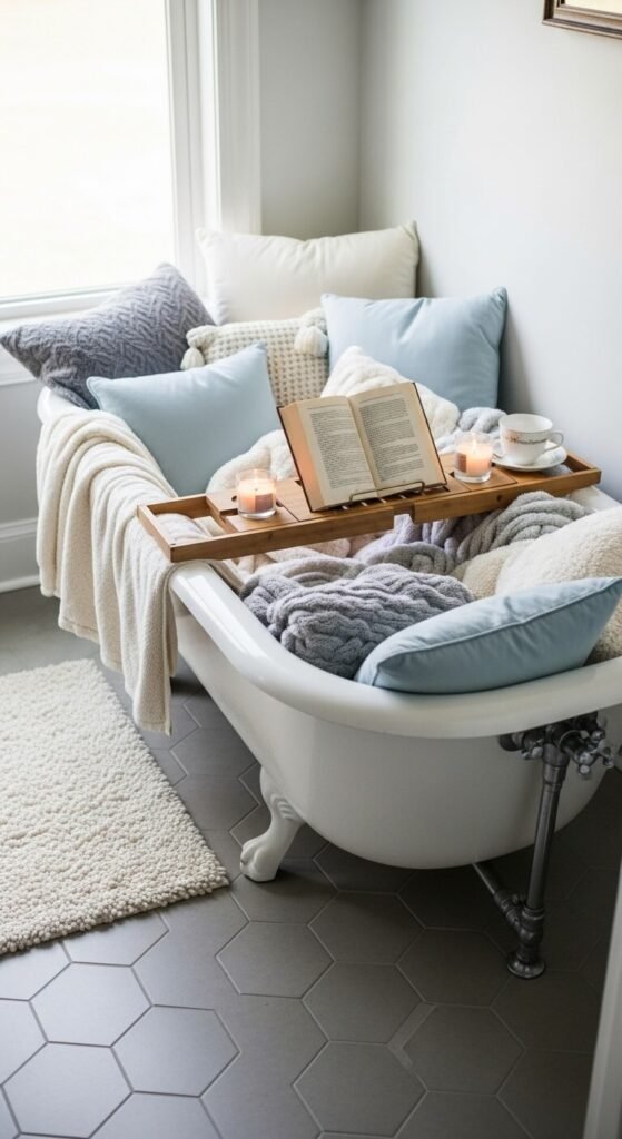 If you have two bathrooms, convert the unused tub. Clean it thoroughly first. Line the bottom with yoga mats for cushioning. Fill with pillows and throws. A bath caddy holds your book and drink. The porcelain sides stay cool, which some people prefer. Hang a curtain for privacy even though it’s not actually a working bath. This quirky solution costs nothing if the tub already exists. The enclosed sides block drafts naturally.