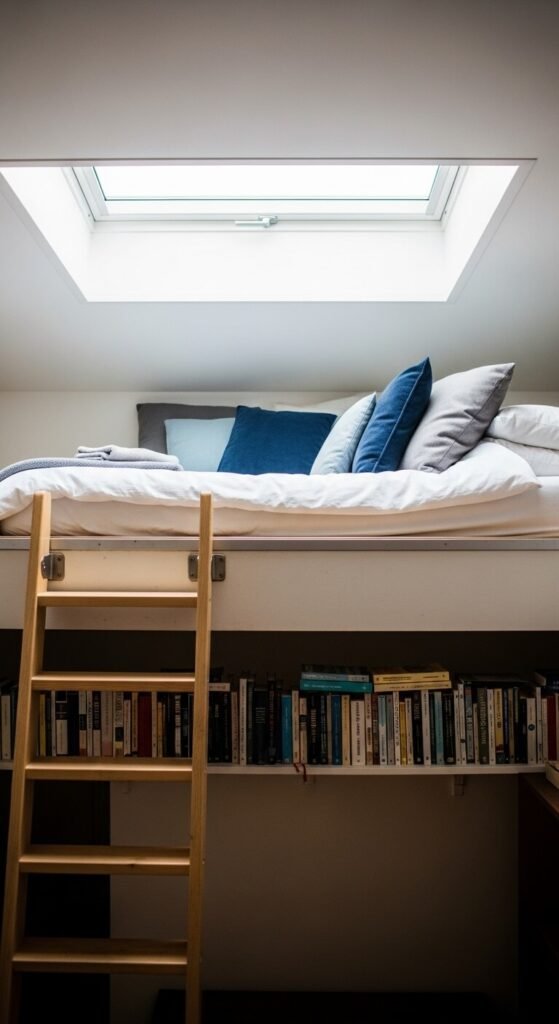 High ceilings allow loft platforms. Hire a carpenter or use strong lumber yourself. The elevated position feels separate from household chaos below. A twin mattress fits most loft builds. Skylights above make daytime reading perfect. String lights work for night. Keep weight limits in mind—code usually requires platforms to hold 40 pounds per square foot. This works best for older kids or adults. Store books up there so you must climb up to retrieve them.