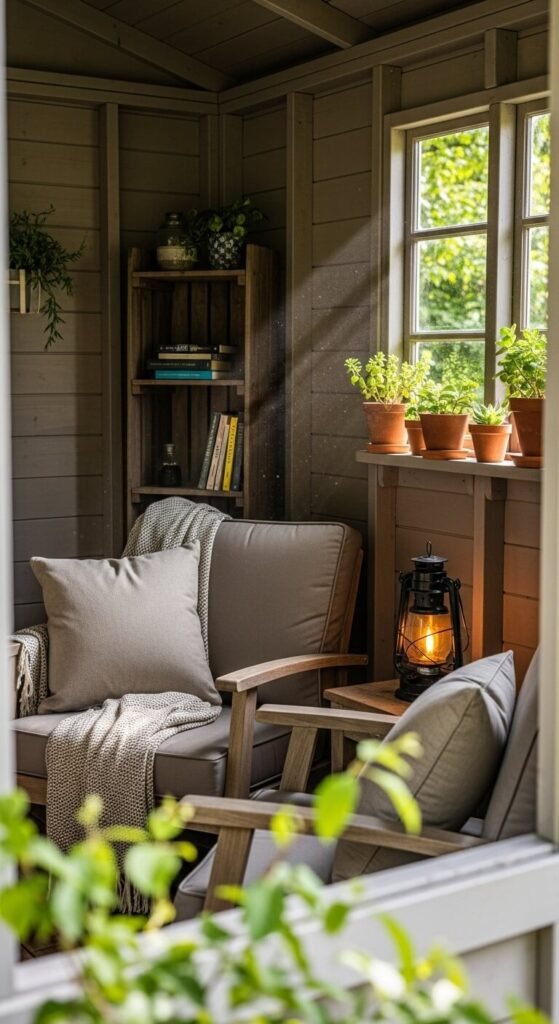 An 8×8 shed becomes your private library. Add insulation if you’ll use it year-round. Battery-powered lights save on electrical work. Weatherproof furniture handles temperature swings. A small space heater works for winter in most climates. The separate building means zero household interruptions. Keep a basket of blankets inside. This costs less than adding interior square footage to your house. Check local codes—some areas require permits for electrical additions.
