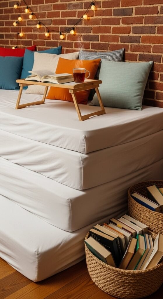 Stack two or three twin mattresses against a wall. Cover with fitted sheets in complementary colors. The height puts you at perfect sitting position. Lean back against the wall with legs stretched out. Place the stack perpendicular to a window for side lighting. This uses old mattresses headed for donation. A lap desk creates a stable reading surface. The extra cushioning beats any regular chair. Disassemble easily when you need floor space.
