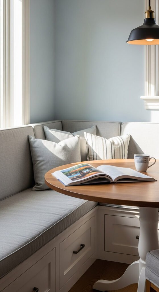 Breakfast nooks work as reading spots outside meal times. Push the table to one side. The booth seating provides back support on two sides. Storage benches hold your book collection underneath. The kitchen location means easy tea refills. A pendant light overhead offers focused illumination. Add a cushion for softer seating. Clean crumbs first—kitchen spaces need regular tidying. This dual-purpose approach maximizes small home functionality.