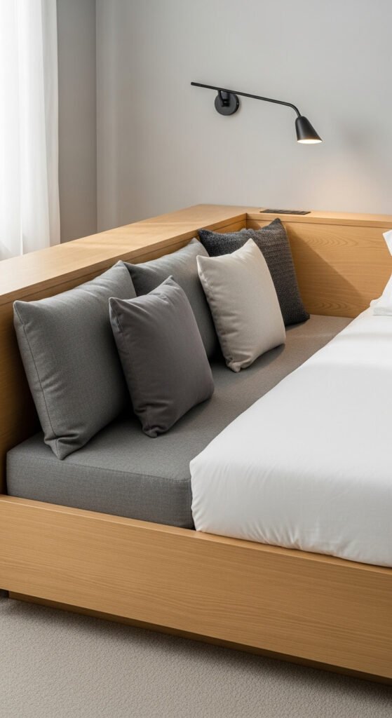 Build your platform bed wider on one side. The extension becomes a reading bench. Install a thin mattress pad on the extended portion. The same height as your bed but feels separate. Mount a reading light directly above the extended section. Storage drawers fit underneath the entire platform. This carpentry project costs $200-400 in materials. The reading spot doesn’t steal any bedroom floor space. Keep sleeping pillows separate from reading pillows for hygiene.
