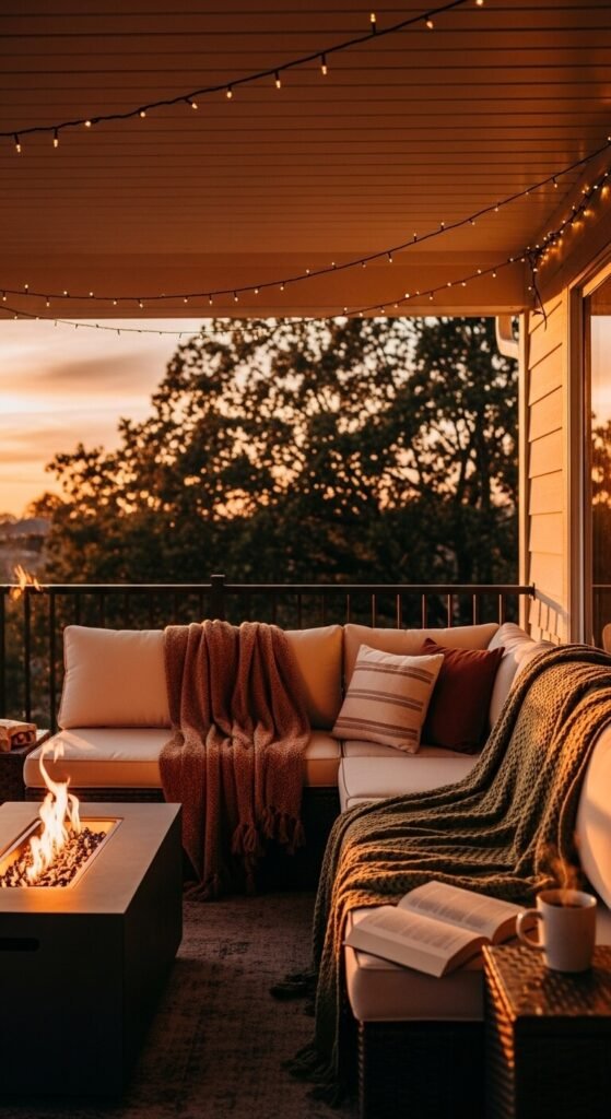 Weather-protected patios extend your reading space outdoors. Waterproof cushions handle occasional moisture. A small heater or fire pit allows three-season use in most climates. The covered roof blocks rain but lets in natural light. String lights make evening reading possible. Keep books in a waterproof bin nearby. The fresh air and nature sounds change the reading experience completely. This requires no construction—just furniture arrangement on existing hardscape.