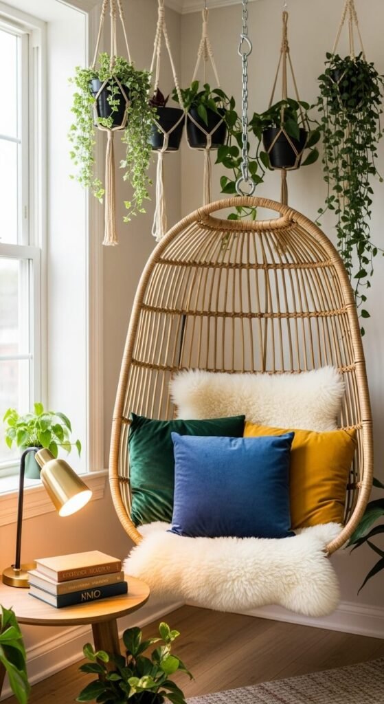Suspend a rattan or wicker chair from a ceiling beam using a heavy-duty hook. Hardware stores sell kits rated for 300+ pounds. Place it near an outlet for a clip-on lamp. The enclosed shape blocks distractions naturally. Add a floor cushion underneath for foot rest. String lights around the top make evening reading magical. Check your lease before drilling—some apartments allow it with proper anchors.