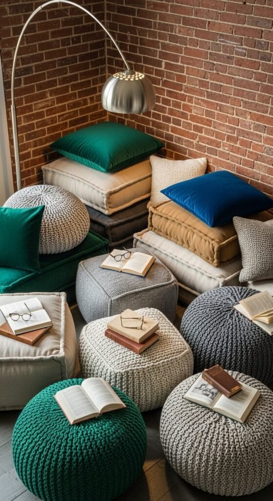 Stack large floor pillows in graduated sizes against a wall. Poufs from HomeGoods or Target cost $30-50 each. Mix textures like corduroy, velvet, and cotton. Place the firmest cushion as back support. The setup moves easily for cleaning or rearranging. Add a lap desk for note-taking while you read. An arc lamp reaches over from behind without taking floor space. This style suits bohemian or minimalist homes equally well.