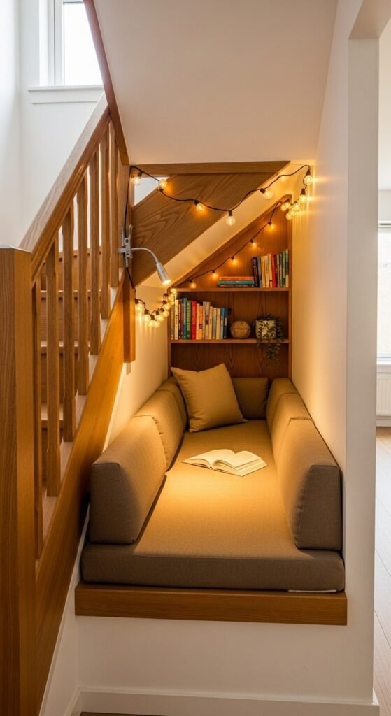 That awkward space under your stairs becomes private quarters. Measure the height carefully—you’ll be sitting, not standing. Install a low bench or place a futon mattress folded in half. Battery-powered stick-on lights work if there’s no outlet. Add a tension rod with a curtain for extra privacy. Kids love this spot too. Use vertical space for narrow shelves. The enclosed feeling makes it wonderfully cave-like for concentration.