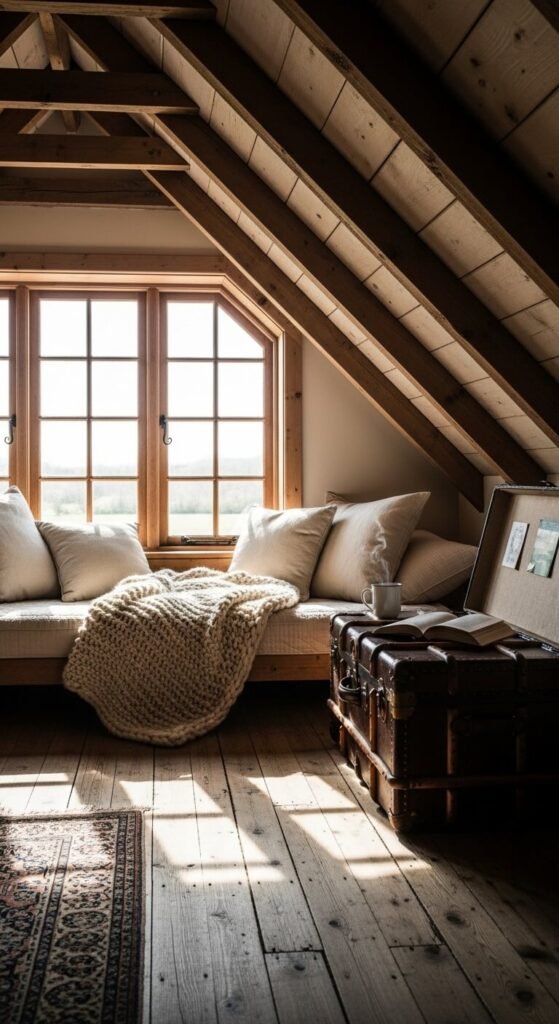 Attic dormers waste space until you add seating. A low daybed or twin mattress fits perfectly. The slanted ceiling feels protective rather than cramped. Hang battery-powered lanterns from the beams. A small fan helps in summer. Area rugs warm up cold floors. Store books in vintage suitcases that double as tables. This works even in unfinished attics if you add proper lighting and comfort layers.
