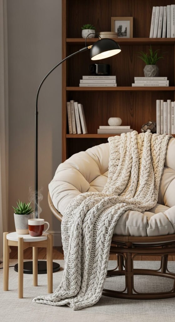 Papasan chairs from Pier 1 or World Market cradle you completely. The bowl shape holds pillows in place naturally. Position it near a corner for back support. A floor lamp reaches over one side. The base spins slightly, which helps you find the perfect reading angle. Extra cushions fill gaps around your body. Machine-washable cushion covers save money on cleaning. At around $200, it’s cheaper than most reading chairs.