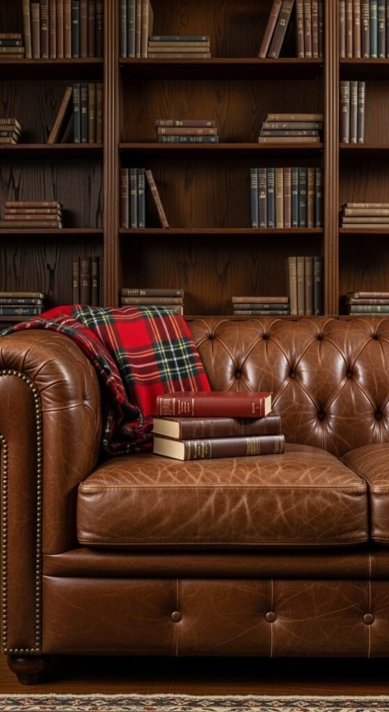 Tufted leather seating defines the aesthetic but costs big money new. Search “Chesterfield style” on Facebook Marketplace for budget options. Faux leather versions from Wayfair start around $400. The tufting and low profile create that English library feel. Add throw pillows in plaid or velvet. Position facing your bookshelf for reading orientation. One statement sofa transforms an entire room’s character.