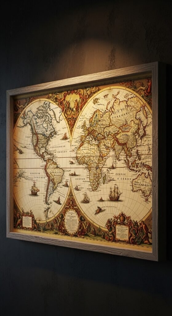 Old maps add scholarly decoration and fill large wall spaces. Print reproductions from library digital collections for free. Frame in dark wood or simple black. Oversized maps make bold statements above sofas or desks. Actual vintage maps from antique stores run $10-30 depending on size. Group smaller maps in gallery walls. They add color while maintaining the intellectual theme.