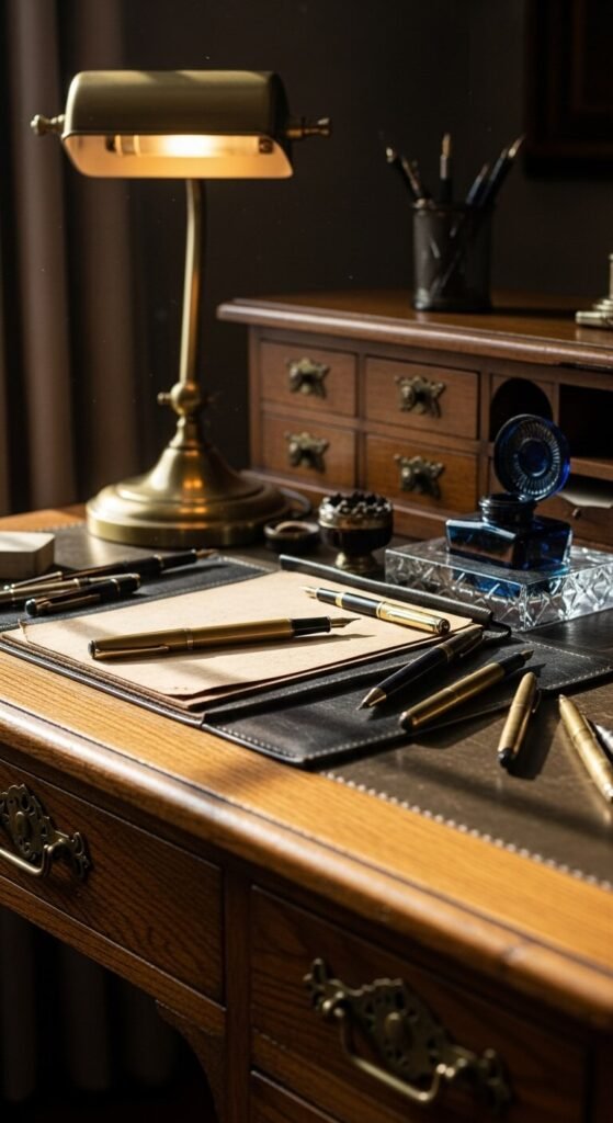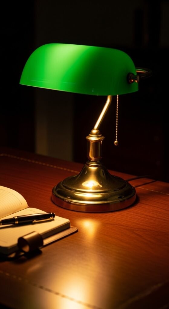 Green glass banker’s lamps scream library vibes. Amazon sells replicas for $35-50 that look expensive. Place on your desk as functional task lighting with style. The warm glow creates perfect ambiance for evening work. LED bulbs save energy while maintaining the vintage aesthetic. Polish the brass occasionally with lemon and salt for shine. One lamp transforms an entire desk setup.