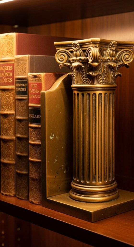 Bookends keep books upright while adding metallic accents. Thrift stores sell mismatched pairs for $5-15. Brass, copper, or bronze metals fit the aesthetic. Heavy ones work best for large books. Use on desks or shelves to create organized book sections. Polish for shine or embrace tarnish for aged character. They solve practical problems while looking intentional and styled.