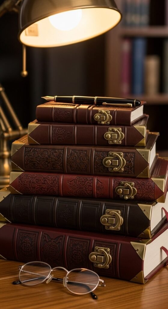 Journals displayed like collected volumes add depth to shelves. Buy affordable leather-bound notebooks from Barnes & Noble or Amazon. Stack horizontally between bookends or vertically on shelves. Actually use them for notes, sketches, or thoughts. The worn covers develop character through handling. Mix sizes and colors for collected appearance. They’re both functional tools and decorative objects that encourage writing.