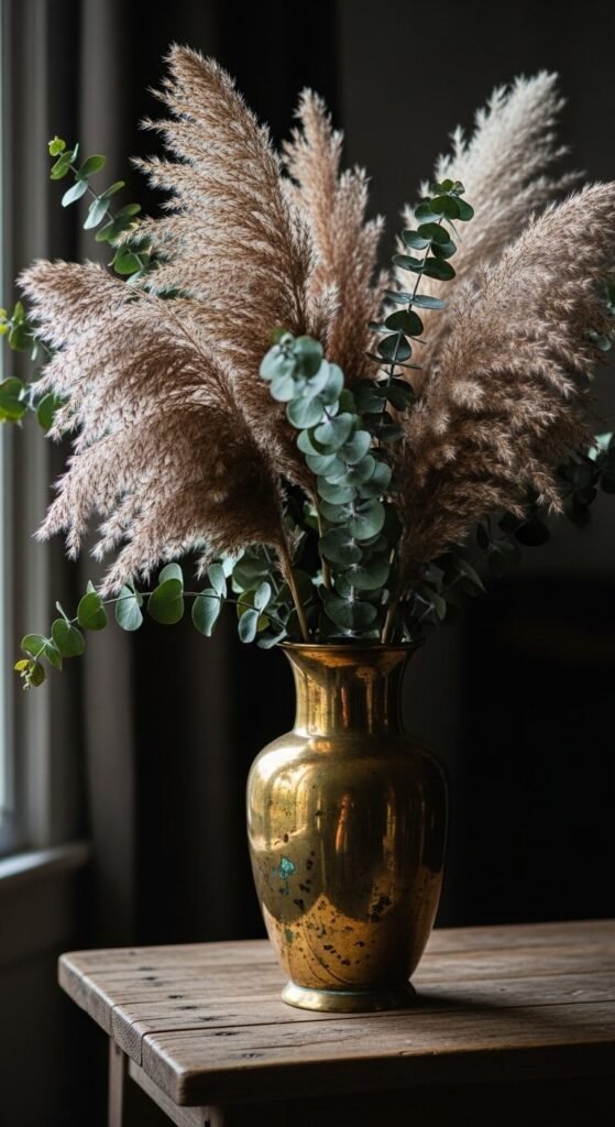 Dried flowers never wilt and add organic shapes. Buy fresh flowers and hang upside down to dry yourself—free after initial purchase. Pampas grass, eucalyptus, and wheat stalks dry beautifully. Display in brass vases, glass bottles, or ceramic crocks. Earth tones and neutral colors work best. Change arrangements seasonally using foraged materials. They soften hard surfaces and add height variation to flat shelves.