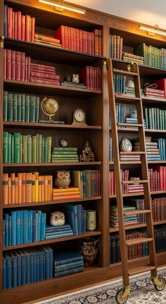 Books displayed vertically create instant intellectual atmosphere. IKEA Billy bookcases work perfectly when painted deep brown or forest green. Arrange books by color or size for visual impact. Mix in decorative objects every few books to break monotony. Fill gaps with thrifted hardcovers from library sales—pay by the bag for maximum value. Add LED strip lighting inside for drama. Use Command strips to secure tall units to walls safely.