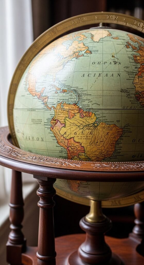 A globe adds scholarly gravitas and conversation-starting geography. Find vintage versions at antique malls for $40-80. Modern reproductions from HomeGoods work too at half the price. Place on a side table or bookshelf corner. The aged map aesthetic matters more than accuracy—you’re not using it for navigation. Smaller desk versions cost less and fit tight spaces. Spin it occasionally during video calls for atmosphere.